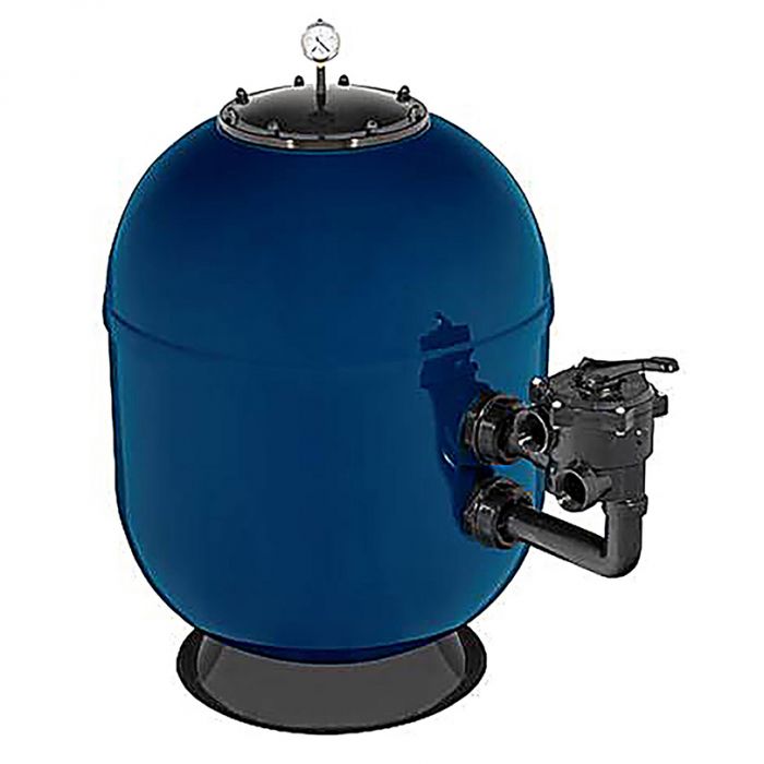 Filtre à sable de type side, cuve monobloc réalisée en polyester.